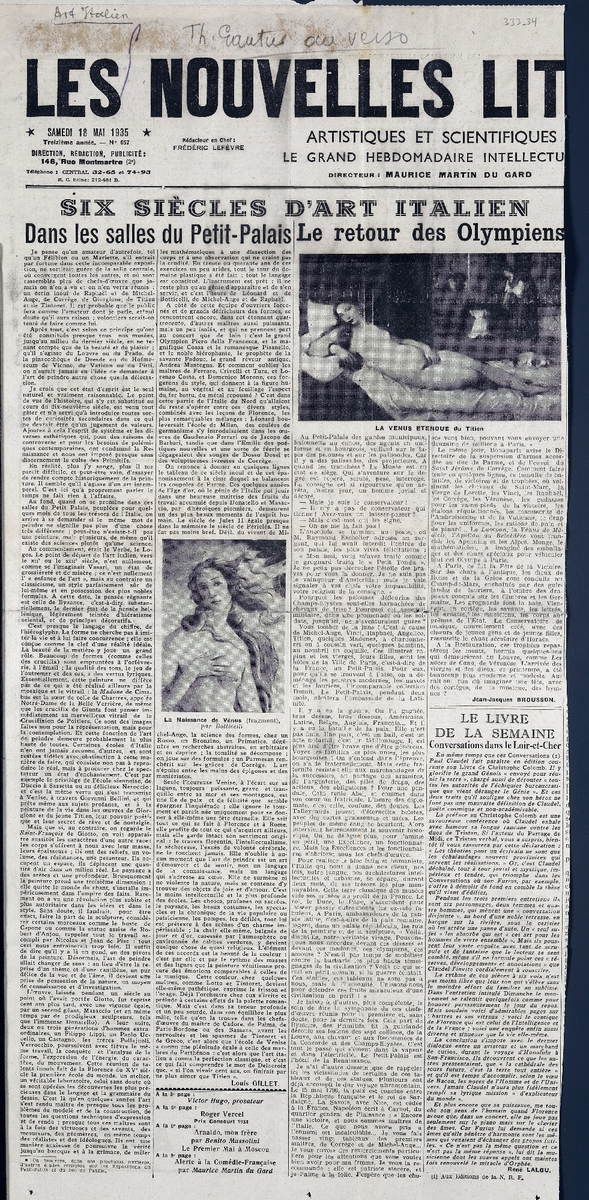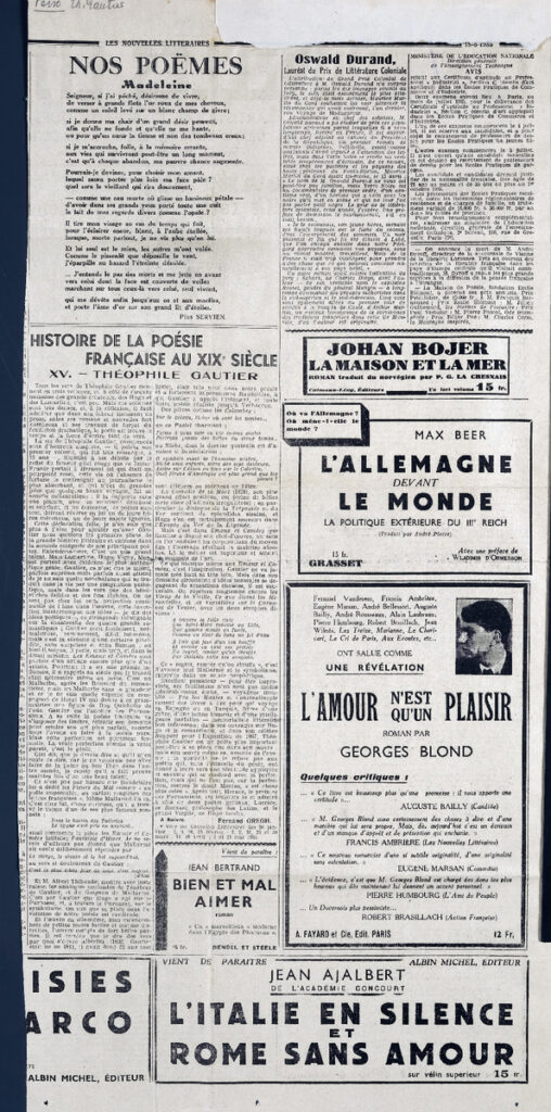 Απόκομμα της εφημερίδας “LES NOUVELLES LITTERAIRES”, έντυπο, στα γαλλικά, χαρτί, δύο όψεις, 60×28 εκ. Το τεκμήριο εικονογραφείται. Πάνω από τον τίτλο επιγραφή με στοιχεία έκδοσης.
