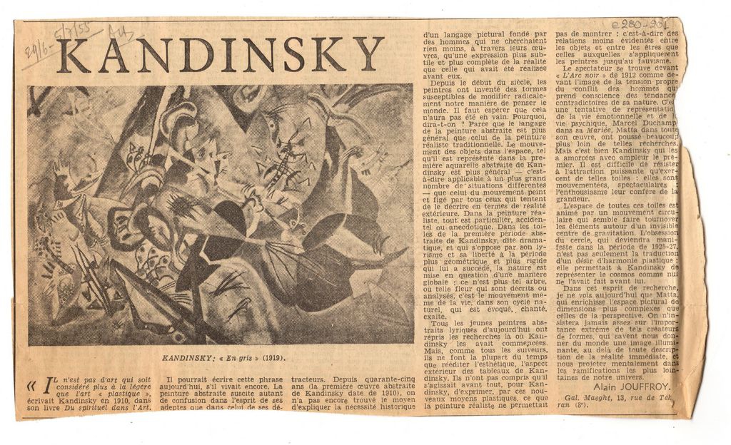 Απόκομμα, χαρτί, 15×26 εκ., στα γαλλικά, δημοσίευσης κριτικής έκθεσης του Wassily Kandinsky, η οποία διεξάγεται στην Galerie Maeght, στο Παρίσι.