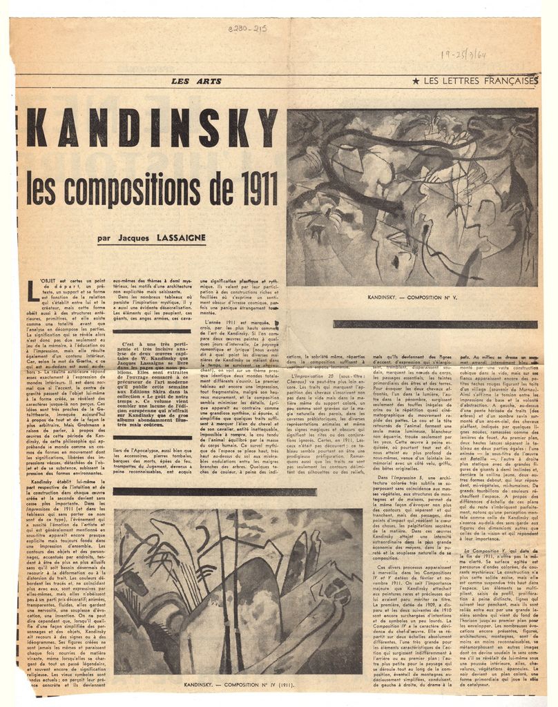 Απόκομμα, χαρτί, 38×31 εκ., στα γαλλικά, δημοσίευσης κειμένου αφιερωμένου σε έργα του Wassily Kandinsky, το οποίο προέρχεται από έκδοση αφιερωμένη στον καλλιτέχνη.