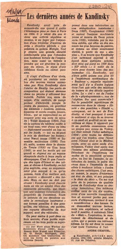 Απόκομμα, χαρτί, 25×11.5 εκ., στα γαλλικά, δημοσίευσης κριτικής έκθεσης του Wassily Kandinsky, η οποία διεξάγεται στην γκαλερί Maeght στο Παρίσι. Στην έκθεση παρουσιάζονται έργα του καλλιτέχνη, τα οποία φιλοτέχνησε στο Παρίσι. Αναγράφονται λεπτομέρειες για την καλλιτεχνική αυτή περίοδό του.