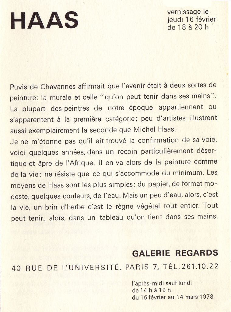Έντυπο, χαρτόνι αναδιπλωμένο, 15,5×11 εκ., στα γαλλικά, έκθεσης του Michel Haas, η οποία διεξάγεται στην Galerie Regards στο Παρίσι. Περιέχει κείμενο για τον καλλιτέχνη.