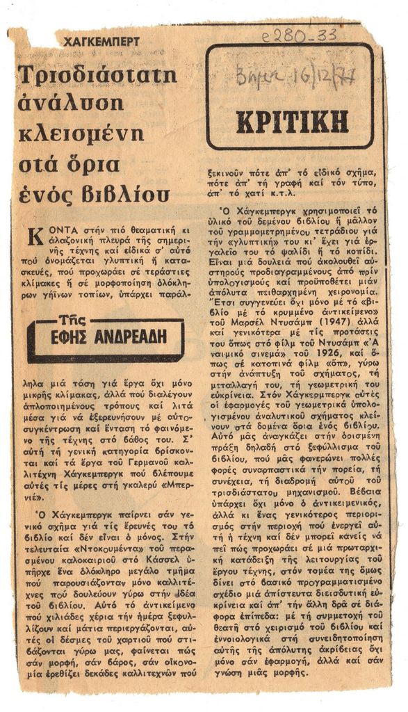 Απόκομμα, χαρτί, 18×10 εκ., στα ελληνικά, δημοσίευσης κριτικής έκθεσης του Helfried Hagenberg, η οποία διεξάγεται στην γκαλερί Jean & Karen Bernier στην Αθήνα. Εντάσσεται στη στήλη “Κριτική” του εντύπου.
