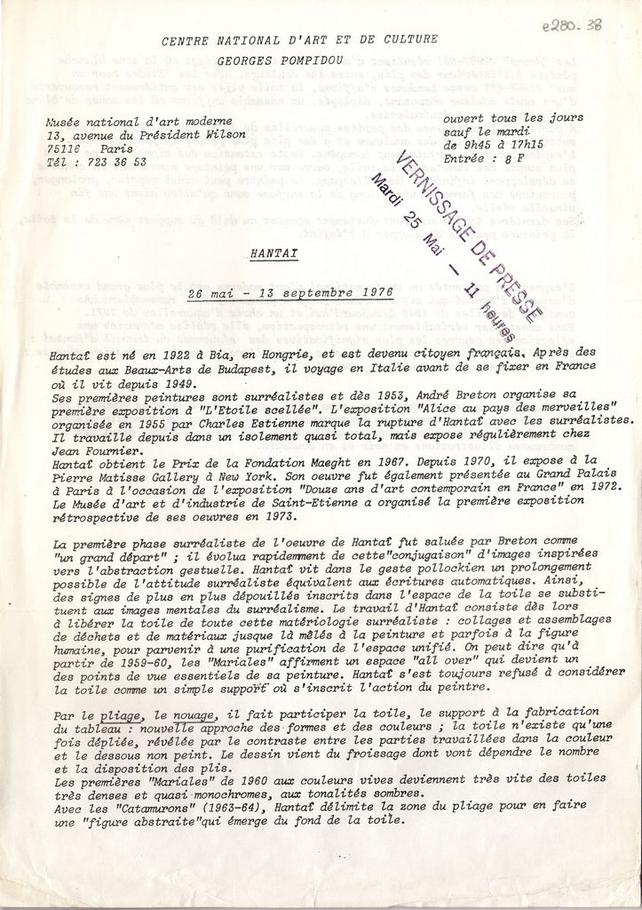 Φωτοαντίγραφο δελτίου τύπου, χαρτί διπλής όψης, 30×21 εκ., στα γαλλικά, έκθεσης του Simon Hantaï στο Centre Georges Pompidou στο Παρίσι. Αναγράφονται λεπτομέρειες για τα έργα του καλλιτέχνη που παρουσιάζονται στην έκθεση και τη διοργάνωση.