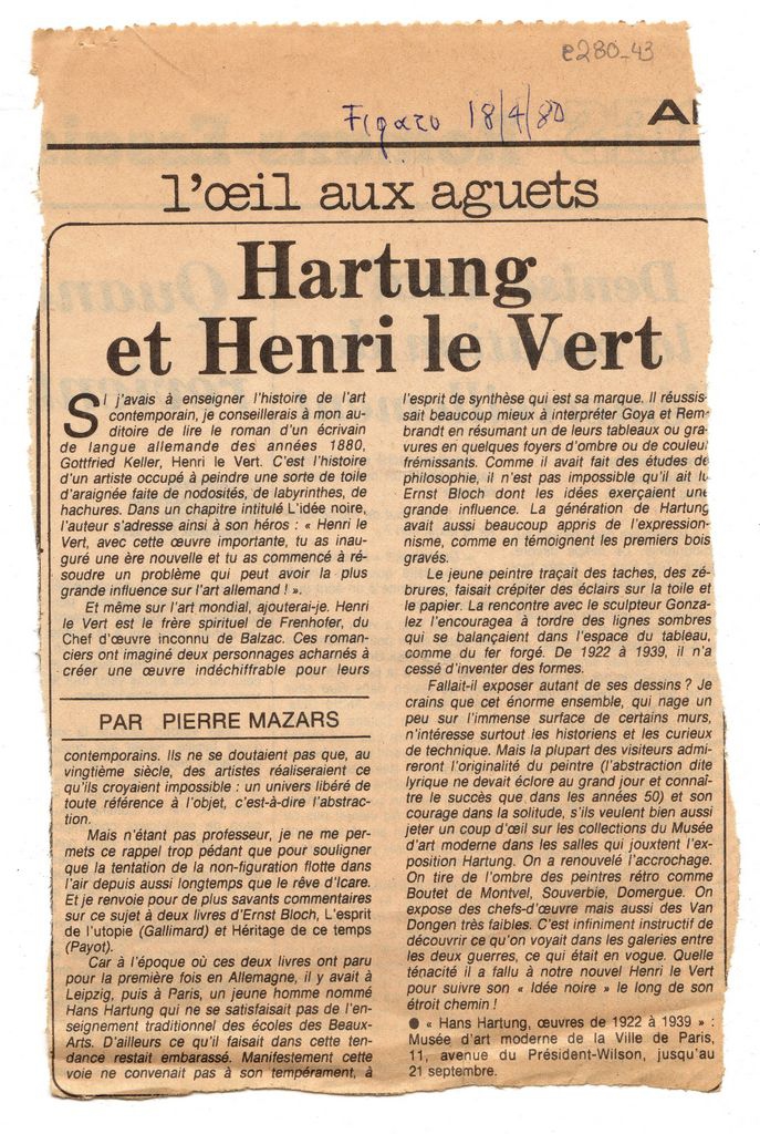 Απόκομμα, χαρτί, 21×13.5 εκ., στα γαλλικά, δημοσίευσης άρθρου αναφερόμενου σε έκθεση του Hans Hartung στo μουσείο Μοντέρνας Τέχνης στο Παρίσι. Γίνεται αναφορά και σύνδεση του έργου του καλλιτέχνη με το μυθιστόρημα “Henri le Vert” του Gottfried Keller.