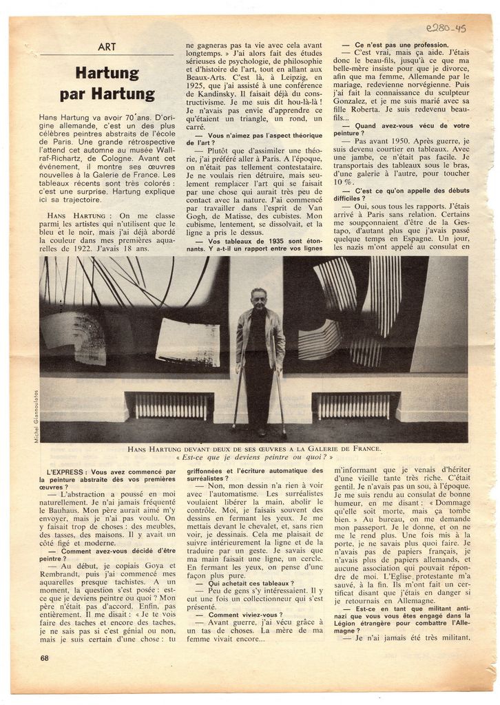 Απόκομμα, χαρτί, 2 φφ, 30×21 εκ., στα γαλλικά, δημοσίευσης συνέντευξης του Hans Hartung, με αφορμή τη συμπλήρωση των 70 χρόνων του και αναδρομικές εκθέσεις του στο Παρίσι και την Κολωνία.