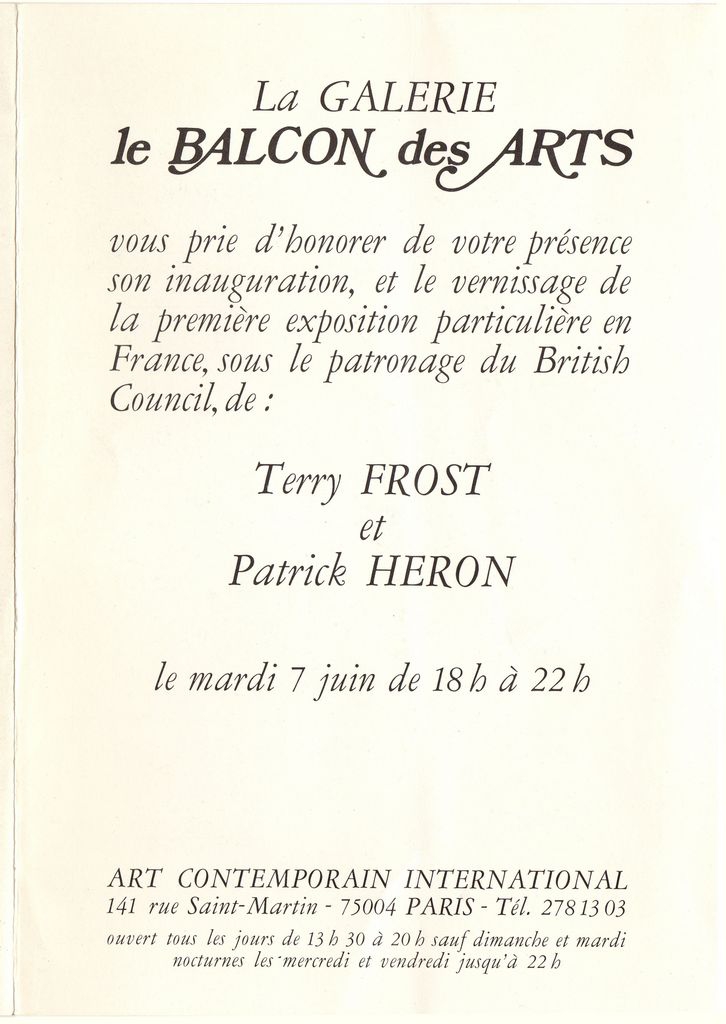 Πρόσκληση, χαρτόνι αναδιπλωμένο, 21×14.5 εκ., στα γαλλικά, εγκαινίων έκθεσης των Terry Frost και Patrick Heron, η οποία διεξάγεται στην Art Contemporain International στο Παρίσι. Στο εσωτερικό του εντύπου σύντομες πληροφορίες για εκθέσεις των καλλιτεχνών.