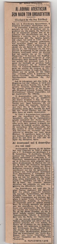 Αι Αθήναια απέκτησαν πάλι δι’ αναστηλώσεως τον ναόν της ιστορικής Μονής των Ομολογητών. Παρά το γήπεδον του Παναθηναϊκού
