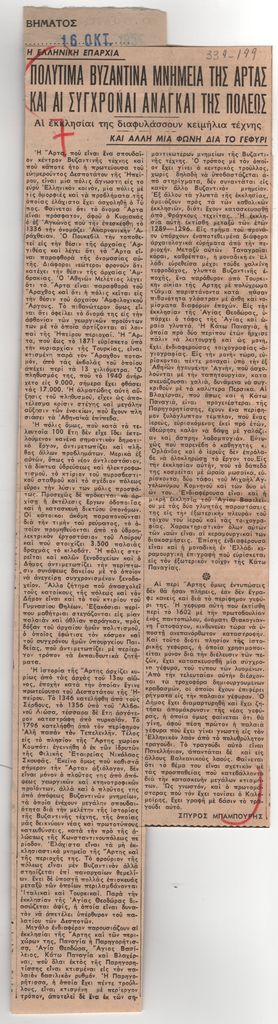 Απόκομμα της εφημερίδας “Το Βήμα”, έντυπο, στα ελληνικά, χαρτί, δύο όψεις, όπου δημοσιεύεται άρθρο του Σπύρου Μπαμπούρη, σχετικά με τους βυζαντινούς ναούς της Άρτας. Το απόκομμα εικονογραφείται. Επικολλημένο απόκομμα χαρτιού εταιρείας αποδελτίωσης.