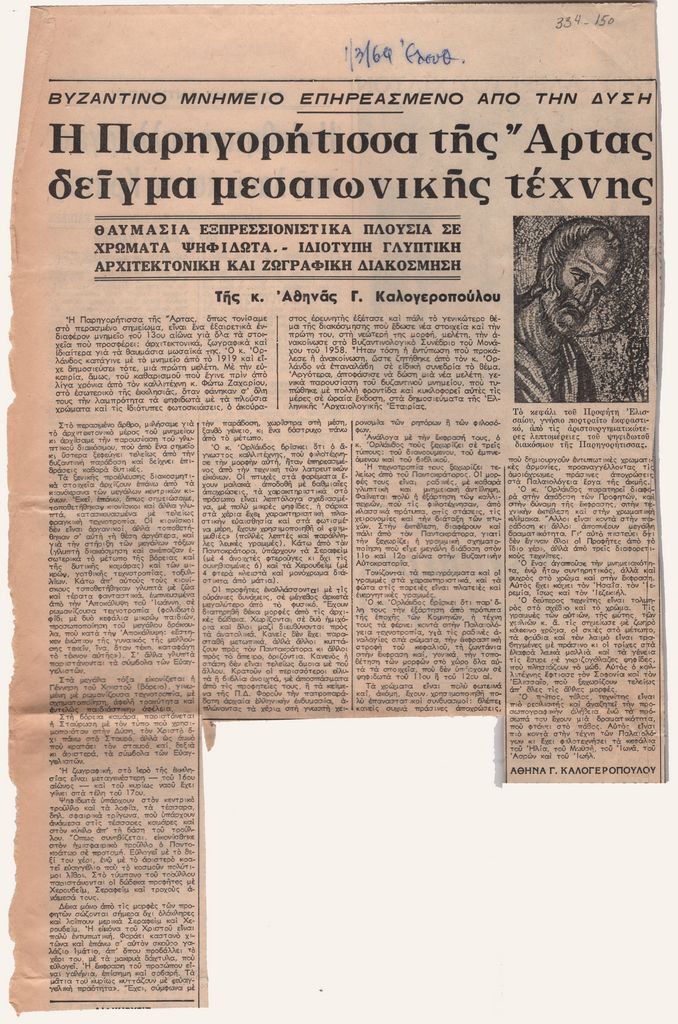 Απόκομμα της εφημερίδας “Ελευθερία”, έντυπο στα ελληνικά, χαρτί, δύο όψεις, όπου δημοσιεύεται άρθρο της αρχαιολόγου Αθ. Γ. Καλογεροπούλου, σχετικά με τον διάκοσμο του Ι.Ν. Παναγίας Παρηγορήτισσας στην Άρτα.