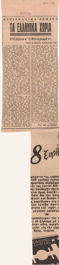 Απόκομμα, έντυπο, στα ελληνικά, χαρτί, διπλής όψης, όπου δημοσιεύεται άρθρο του λογοτέχνη Φώτη Κόντογλου. Πάνω από τον τίτλο, επιγραφή με στοιχεία της έκδοσης.