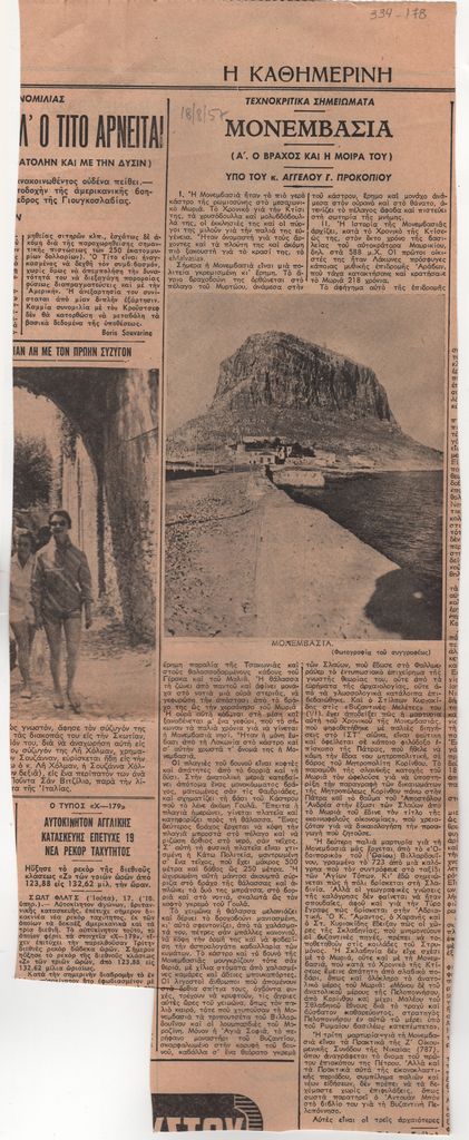 Απόκομμα της εφημερίδας “Η Καθημερινή “, έντυπο, στα ελληνικά, χαρτί, δύο όψεις, όπου δημοσιεύεται άρθρο του τεχνοκριτικού Άγγ. Γ. Προκοπίου. Το απόσπασμα εικονογραφείται. Πάνω από τον τίτλο, επιγραφή με στοιχεία της έκδοσης.
