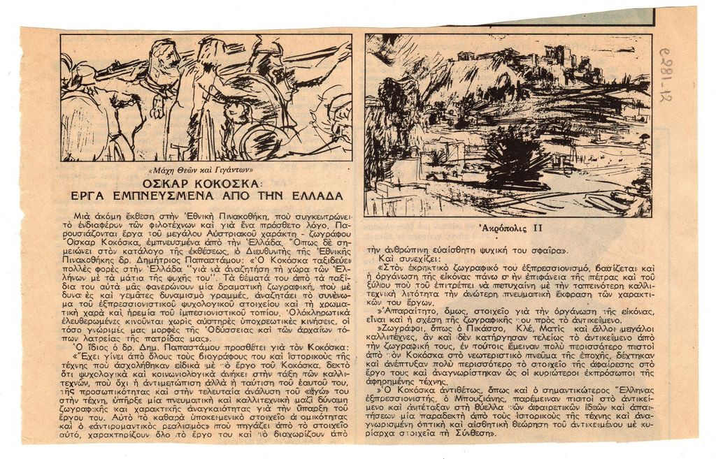 Απόκομμα, έντυπο, χαρτί, 13,0×21,2 εκ., όπου δημοσιεύεται, άρθρο για την έκθεση σχεδίων του Αυστριακού καλλιτέχνη Oskar Kokoschka, που διοργανώθηκε στην Εθνική Πινακοθήκη στην Αθήνα το 1976. Περιέχει εκτεταμένα αποσπάσματα του κειμένου του Δημήτριου Παπαστάμου, Διεθυντή της Εθνικής Πινακοθήκης από τον κατάλογο της έκθεσης.