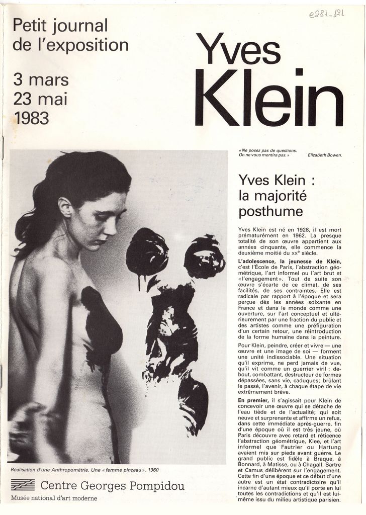 Έντυπο, στα γαλλικά, οκτασέλιδο, χαρτί ιλουστρασιόν, 29,8×21,2 εκ. Αφιέρωμα στην αναδρομική έκθεση έργων του Yves Klein που διοργανώθηκε στο Παρίσι το 1983. Περιέχει βιογραφικά στοιχεία, κείμενο για το έργο του καλλιτέχνη του Jean-Yves Mock, αποσπάσματα από το ημερολόγιο του καλλιτέχνη – που περιλαμβάνεται αυτούσιο στον κατάλογο της έκθεσης – με τίτλο “Yves Klein: ‘L’aventure monochrome'”. Στο οπισθόφυλλο: πλάνο της έκθεσης, παράλληλες εκδηλώσεις και βιβλιογραφία για τον καλλιτέχνη.