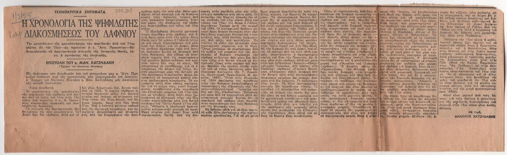 Απόκομμα της εφημερίδας “Η Καθημερινή”, έντυπο, στα ελληνικά, χαρτί, διπλής όψης, όπου δημοσιεύεται άρθρο του βυζαντινολόγου Μαν. Χατζηδάκη, σχετικά με την Μονή Δαφνίου. Το απόσπασμα εικονογραφείται. Κάτω από τον τίτλο, επιγραφή με στοιχεία της έκδοσης.
