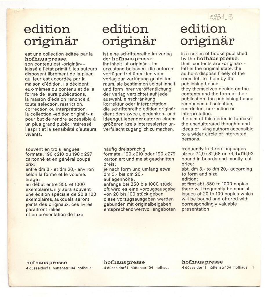 Έντυπο, στα γαλλικά, γερμανικά και αγγλικά, μονόφυλλο, χαρτόνι, 21,0×19,0 εκ. Ενημερωτικό φυλλάδιο για τη σειρά Edition originär από τον εκδοτικό οίκο Hofhaus presse στο Düsseldorf της Γερμανίας.