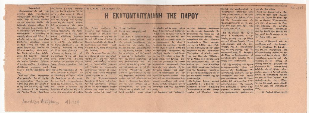 Απόκομμα της εφημερίδας “Η Βραδυνή”, έντυπο, στα ελληνικά, χαρτί, διπλής όψης, όπου δημοσιεύεται άρθρο του αρχαιολόγου Μ. Παρασκευαΐδη.