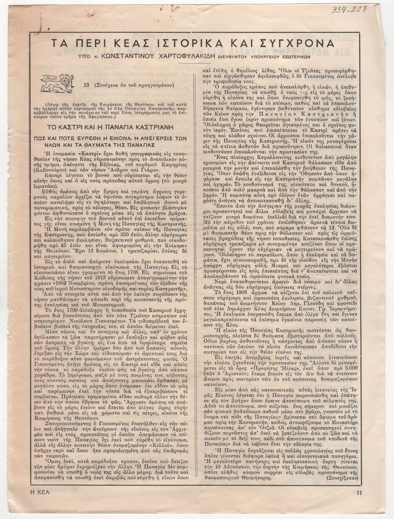 Απόκομμα, έντυπο, στα ελληνικά, χαρτί, διπλής όψης, όπου δημοσιεύεται κείμενο του Κωνσταντίνου Χαρτοφυλακίδη.