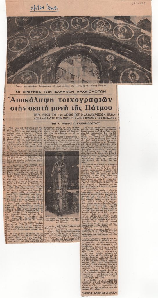 Απόκομμα της εφημερίδας “Ελευθερία”, έντυπο, στα ελληνικά, χαρτί, διπλής όψης, όπου δημοσιεύεται άρθρο της αρχαιολόγου Αθηνάς Γ. Καλογεροπούλου. Το απόσπασμα εικονογραφείται. Πάνω αριστερά, επιγραφή με στοιχεία της έκδοσης.