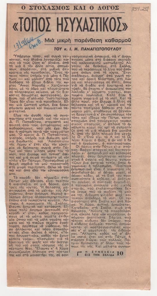 Απόκομμα της εφημερίδας “Ελευθερία”, έντυπο, στα ελληνικά, χαρτί, δύο τμήματα διπλής όψης, όπου δημοσιεύεται άρθρο του συγγραφέα Ι. Μ. Παναγιωτόπουλου. Κάτω από τον τίτλο, επιγραφή με στοιχεία της έκδοσης.