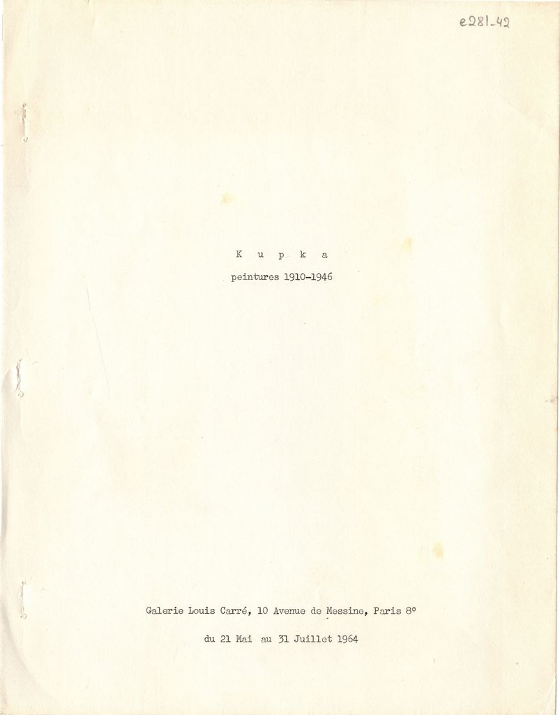 Κείμενο, στα γαλλικά, δακτυλόγραφο, χαρτί, 27,0×21,0 εκ. Έντυπο υλικό της έκθεσης έργων του Τσέχου καλλιτέχνη Frantisek Kupka που πραγματοποιήθηκε στο Παρίσι το 1964. Περιέχει βιογραφικό καλλιτέχνη, αποσπάσματα από κείμενά του και αποσπάσματα από δημοσιεύματα. Περιλαμβάνει κατάλογο των έργων της έκθεσης και πίνακα περιεχομένων.