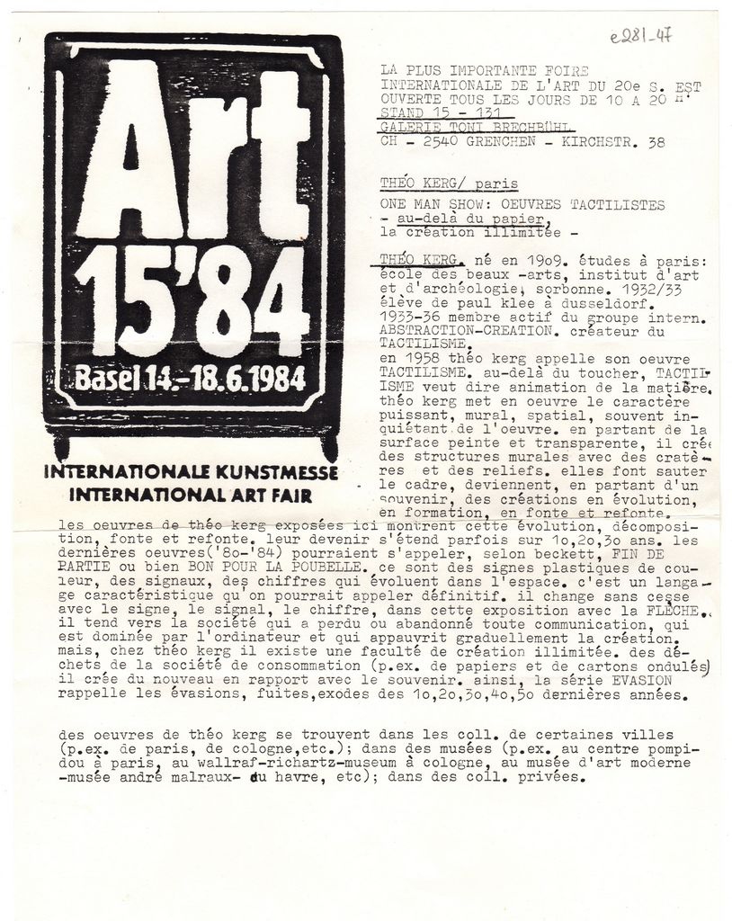 Κείμενο, δακτυλόγραφο, στα γαλλικά, χαρτί, 27,7×27,3 εκ. Φυλλάδιο της ατομικής έκθεσης έργων του εικαστικού καλλιτέχνη Théo Kerg, που διοργανώθηκε στο πλαίσιο του Foire Internationale de l’Art de 20e s. στη Βασιλεία τον Ιούνιο του 1984.
