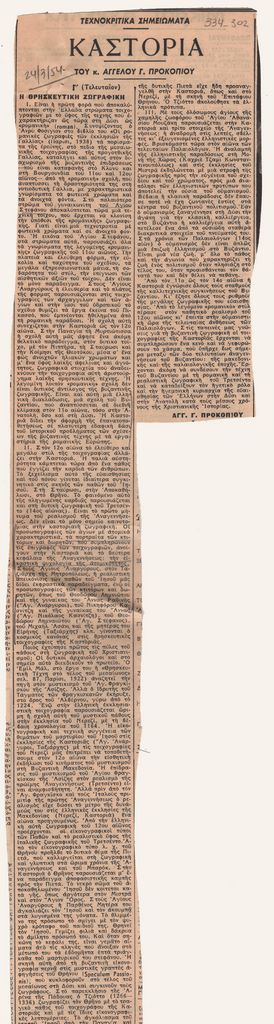 Απόκομμα, έντυπο, στα ελληνικά, χαρτί, διπλής όψης, όπου δημοσιεύεται άρθρο του τεχνοκριτικού Άγγ. Γ. Προκοπίου. Αριστερά από τον τίτλο, επιγραφή με στοιχεία της έκδοσης.