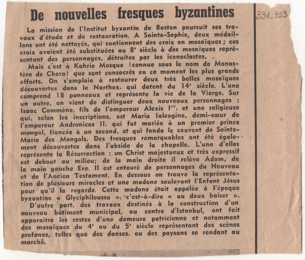 Απόκομμα, έντυπο, στα γαλλικά, χαρτί, διπλής όψης, όπου δημοσιεύεται άρθρο σχετικά με βυζαντινές τοιχογραφίες που ήρθαν στο φως.