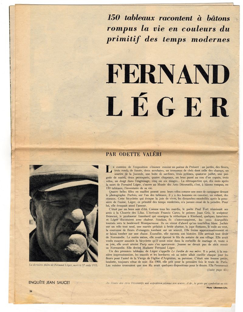 Απόκομμα, χαρτί, 5 φφ, 35×26.5 εκ., στα γαλλικά, δημοσίευσης αφιερώματος στον Fernand Léger, με αφορμή αναδρομική έκθεση αφιερωμένη στον καλλιτέχνη, η οποία διεξάγεται στο Musée des Arts Décoratifs στο Παρίσι.