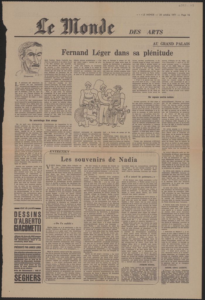 Απόκομμα, χαρτί, 50×34 εκ., στα γαλλικά, δημοσίευσης κριτικής έκθεσης Fernand Léger, η οποία διεξάγεται στο Grand Palais στο Παρίσι.