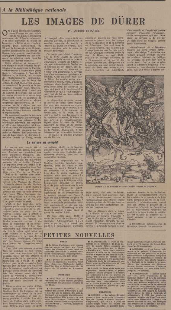 Απόκομμα, χαρτί, 50×34 εκ., στα γαλλικά, δημοσίευσης εκθεσιολογίου της περιόδου. Αναγράφονται οι εξής: ομαδκή των Cartier-Gunter-Reid στο Centre Culturel Americain, Steve Lecler στην Galerie Jean Camion, με θέμα τη ζωγραφική στο χαρτί στην Galerie Maeght, Courbet στο Δημαρχείο της Gentilly, Remington στην Darthea Speyer, F. Szulman στην Regis Langloys, Louis Pons στην Point Cardinal, Catty στην Albertus Magnus, Léger στο Centre d’ Art International, Santamaria στην Galerie de France, Sébire στην Wally Findlay, J. -P. Missoffe στην H. Bénézit, αφιέρωμα στον Picasso στην Galerie du Passeur, Monneret στο Atelier Matignon, Jean Even στην Iris, Goerg στην Drouant, Cadiou στην Galerie Spatz της Βασιλείας, Hamilton-Hockney- Jones-Caulfield στην Galerie Bama, Halnaut στην M. Bernheim, A. -M. Terracini στην βιβλιοθήκη της Mantes- la- Jolle, Yves Faucher στην Entremonde, Calderata στην Denise René, “Surréalistes-petits formats” στην J. B. Diette και M. Dubois στην Galerie de l’ Université.