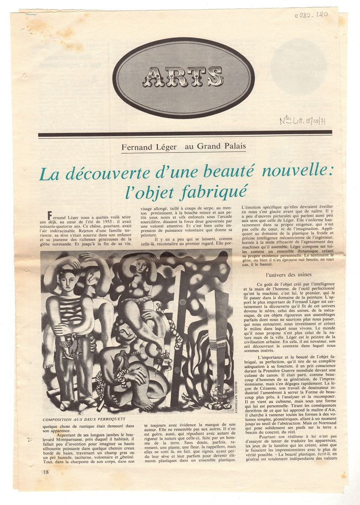 Απόκομμα, χαρτί, 2 φφ, 36.5×25.5 εκ., στα γαλλικά, δημοσίευσης άρθρου αφιερωμένου στον Fernand Léger, με αφορμή αναδρομική έκθεση, η οποία διεξάγεται στο Grand Palais στο Παρίσι. Στο ίδιο, “L’ Exposition”, σύντομη κριτική της έκθεσης.