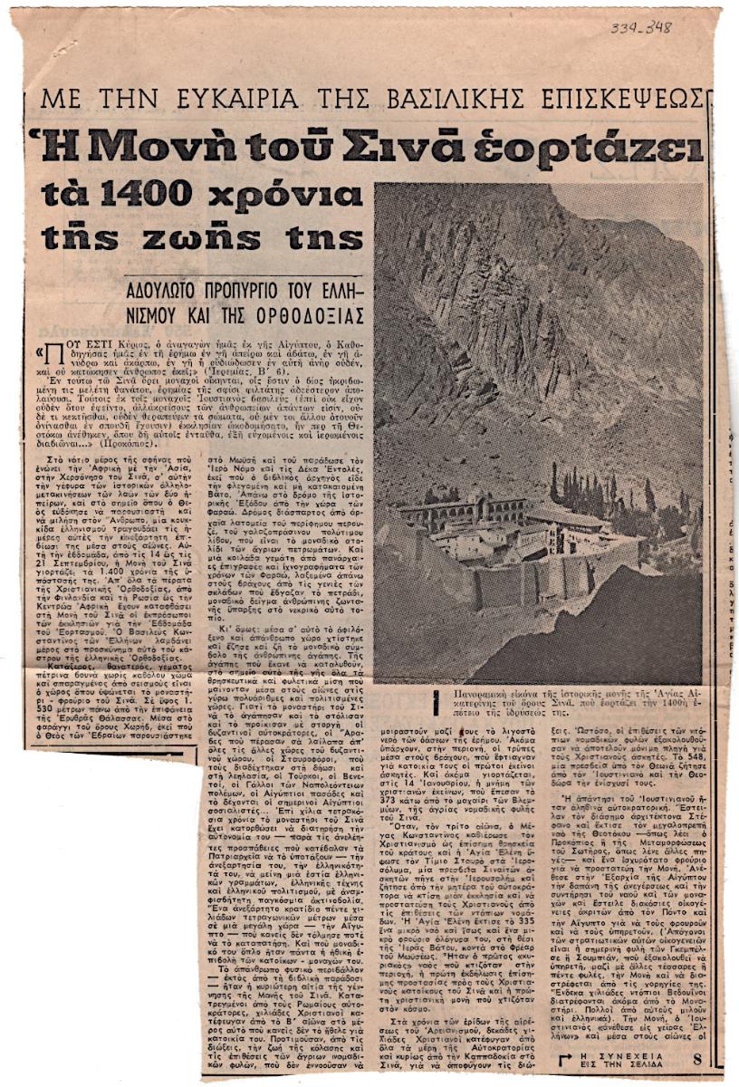 Απόκομμα της εφημερίδας “Ελευθερία”, έντυπο, στα ελληνικά, χαρτί, δύο τμήματα διπλής όψης. Άρθρο του/της Μ.Ζ. για τους εορτασμούς των 1.400 χρόνων της Μονής Σινά.