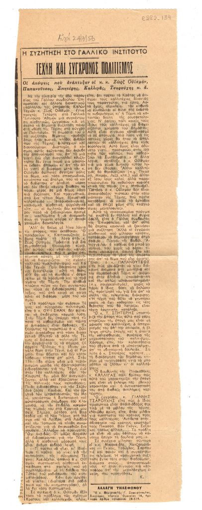 Απόκομμα, χαρτί, 36×11.5 εκ., στα ελληνικά, δημοσίευσης άρθρου το οποίο σχολιάζει και μεταφέρει εντυπώσεις από ανοικτή συζήτηση που πραγματοποιήθηκε στο Γαλλικό Ινστιτούτο Αθηνών, με αφορμή την διάλεξη του Georges Huisman, με θέμα την Τέχνη και τον σύγχρονο πολιτισμό.