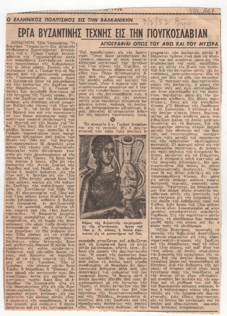 Ο Ελληνικός πολιτισμός εις την βαλκανικήν. Έργα βυζαντινής τέχνης εις την Γιουγκοσλαβίαν. Αγιογραφίαι όπως του Άθω και του Μυστρά