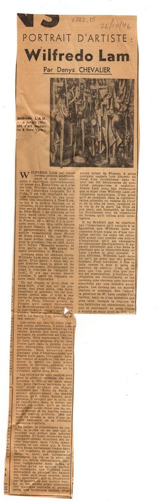 Απόκομμα, χαρτί ακανόνιστου μεγέθους, στα γαλλικά, δημοσίευσης άρθρου αφιερωμένου στη ζωή και στο εικαστικό έργο του Wifredo Lam.