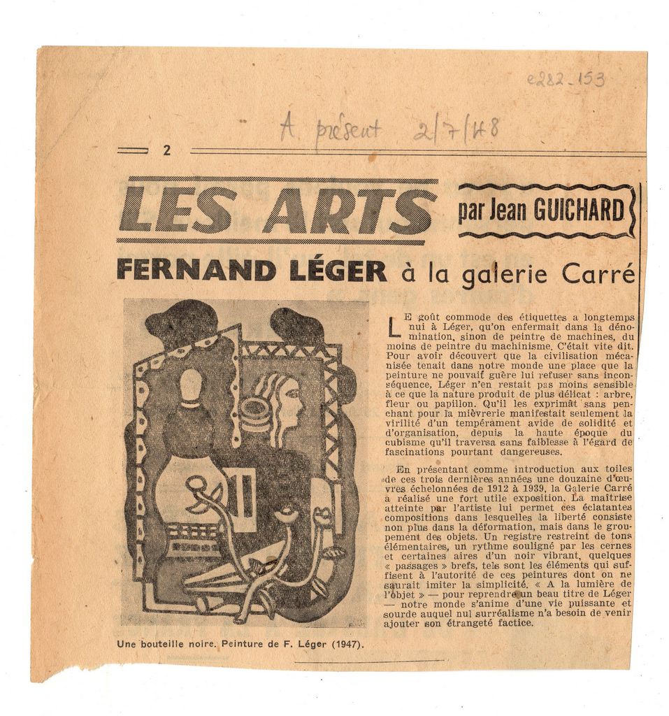 Απόκομμα, χαρτί, 17,5×17 εκ., στα γαλλικά, δημοσίευσης κριτικής έκθεσης Fernand Léger, η οποία διεξάγεται στην γκαλερί Louis Carré στο Παρίσι.