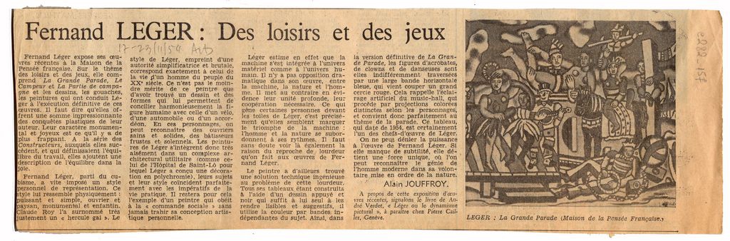 Απόκομμα, χαρτί, 10×30 εκ., στα γαλλικά, δημοσίευσης κριτικής έκθεσης Fernand Léger, η οποία διεξάγεται στην Maison de la Pensée Française στο Παρίσι. Σχολιάζονται τα έργα που παρουσιάζονται σε αυτή.