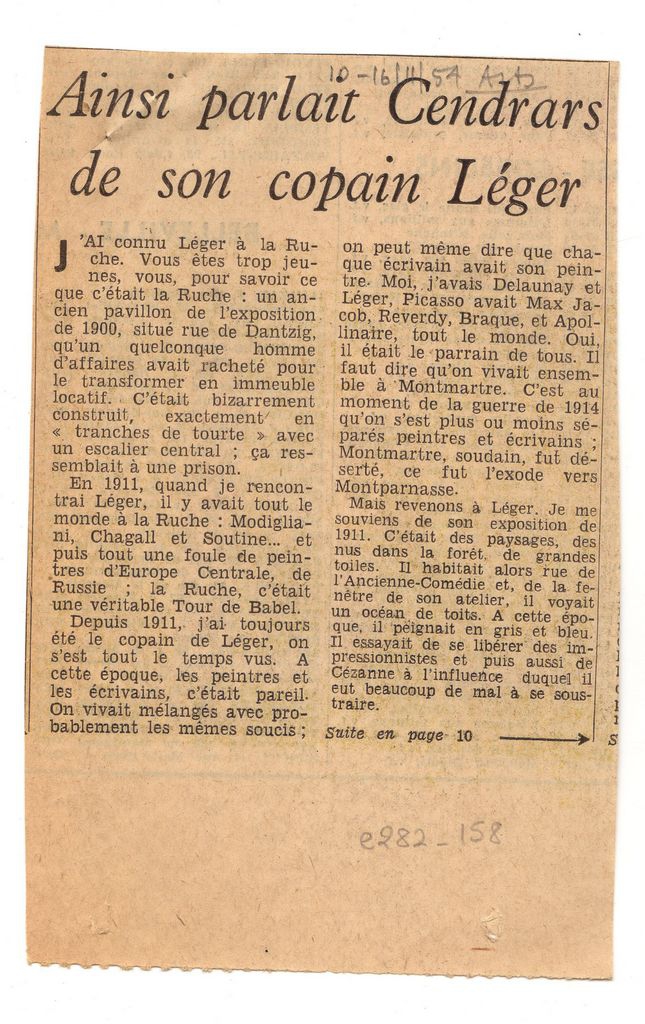Απόκομμα, χαρτί, 2 φφ, 16×10 και 18×31 εκ., στα γαλλικά, δημοσίευσης συνέντευξης του Blaise Cendrars, στην οποία αναφέρεται στην γνωριμία και σχέση του με τον Fernand Léger. Αφορμή έκθεση του καλλιτέχνη στην Maison de la Pensée Française στο Παρίσι.