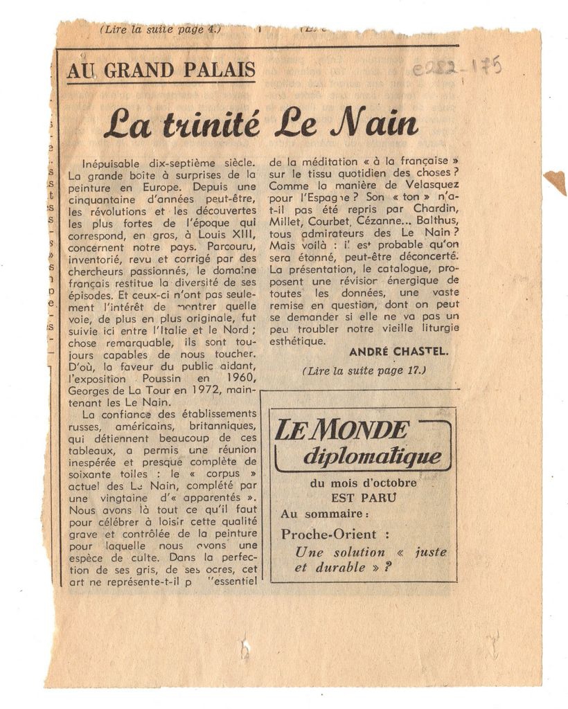 Απόκομμα, χαρτί, 2 φφ, 16×12 και 25×34 εκ., στα γαλλικά, δημοσίευσης κριτικής αναδρομικής έκθεσης αφιερωμένης στους αδερφούς Le Nain (Antoine- Louis-Mathieu), η οποία διεξάγεται στο Grand Palais στο Παρίσι. Αναγράφονται λεπτομέρειες για τη διοργάνωση και τα έργα που παρουσιάζονται.