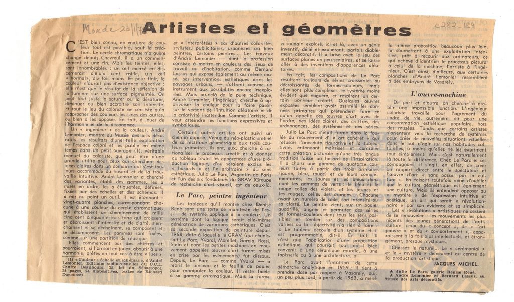 Απόκομμα, χαρτί, 16×26.5 εκ., στα γαλλικά, δημοσίευσης κριτικής εκθέσεων των André Lemmonier και Bernard Lassus στο Μουσείο Διακοσμητικών Τεχνών και Julio Le Parc στην γκαλερί Denise René στο Παρίσι. Αναγράφονται λεπτομέρειες και σχόλια για το εικαστικό τους έργο.