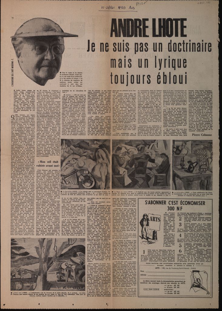 Απόκομμα, χαρτί, 60×42 εκ., στα γαλλικά, δημοσίευσης συνέντευξης του André Lhote, με αφορμή εκθέσεις του οι οποίες διεξάγονται παράλληλα στην Maison de la Pensée Française και στην Galerie Marcel Guiot στο Παρίσι. Αναγράφονται λεπτομέρειες για τη ζωή και το έργο του.