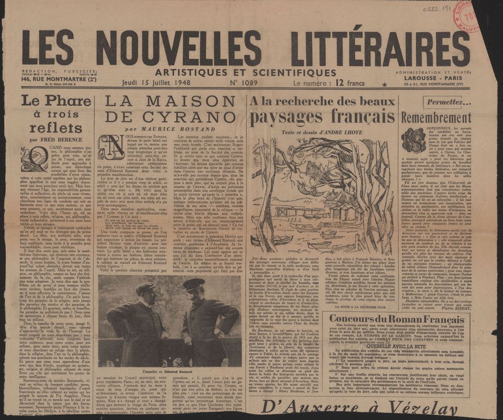 Απόκομμα, χαρτί διπλής όψης, 36×43 εκ., στα γαλλικά, δημοσίευσης κειμένου του André Lhote, στο οποίο περιγράφει το πάθος του να ανακαλύπτει καινούρια μέρη. Στο κέιμενο αναφέρεται στην Arcasson. Στο ίδιο απόκομμα, αποσπάσματα άρθρων πολιτιστικού ενδιαφέροντος.