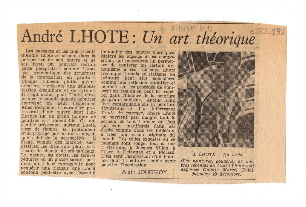Απόκομμα, χαρτί, 10×16 εκ., στα γαλλικά, δημοσίευσης κριτικής έκθεσης André Lhote, η οποία διεξάγεται στην γκαλερί Marcel Guiot στο Παρίσι. Σχολιάζονται τα τοπία και τα γυμνά του που παρουσιάζονται σε αυτή.