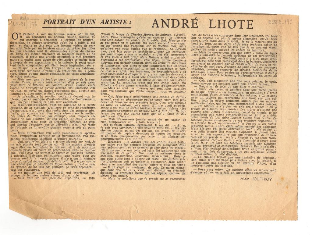 Απόκομμα, χαρτί, 19×26.5 εκ., στα γαλλικά, δημοσίευσης συνέντευξης του André Lhote.