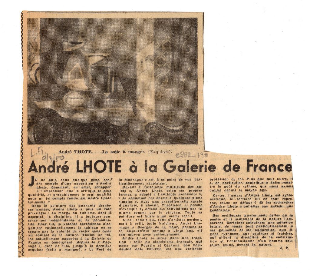 Απόκομμα, χαρτί ακανόνιστου μεγέθους, στα γαλλικά, δημοσίευσης κριτικής έκθεσης André Lhote, η οποία διεξάγεται στην Galerie de France στο Παρίσι. Σχολιάζονται έργα του καλλιτέχνη που παρουσιάζονται σε αυτή.