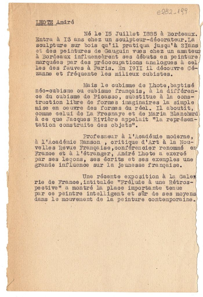 Δακτυλόγραφο, χαρτί, 21,5×14 εκ., στα γαλλικά σημείωμα του André Lhote. Αναγράφονται πληροφορίες για τη ζωή και το έργο του.