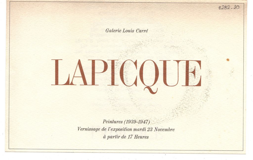 Έντυπο, χαρτόνι αναδιπλωμένο, 13,5×21 εκ., στα γαλλικά, έκθεσης του Charles Lapicque, η οποία διεξάγεται στην γκαλερί Louis Carré στο Παρίσι. Περιέχει κατάλογο των έργων που παρουσιάζονται στην έκθεση και συλλογές όπου αυτά φυλάσσονται.