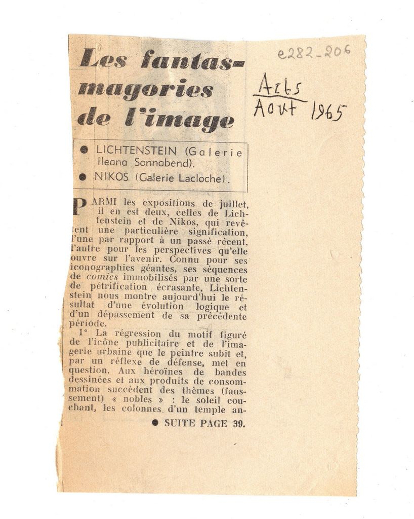 Απόκομμα, χαρτί, 2 φφ, 14,5×9 και 12×14 εκ., στα γαλλικά, δημοσίευσης κριτικής εκθέσεων των Νίκου Κεσσανλή και Roy Lichtenstein, οι οποίες διεξάγονται στις γκαλερί Lacloche και Ileana Sonnabend αντίστοιχα.