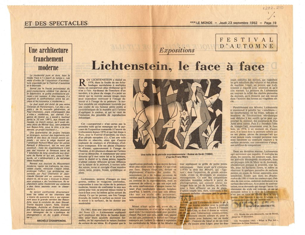 Απόκομμα, χαρτί, 26×33 εκ., στα γαλλικά, δημοσίευσης κριτικής έκθεσης αφιερωμένης στον Roy Lichtenstein, η οποία διεξάγεται στο Musée des Arts Décoratifs στο Παρίσι, στο πλαίσιο του Festival d’ Automne. Αναγράφονται λεπτομέρειες για τα έργα του καλλιτέχνη και σημειώνεται συνέντευξή του στον Gene Swenson, στην οποία αναφέρεται στην ζωγραφική του.