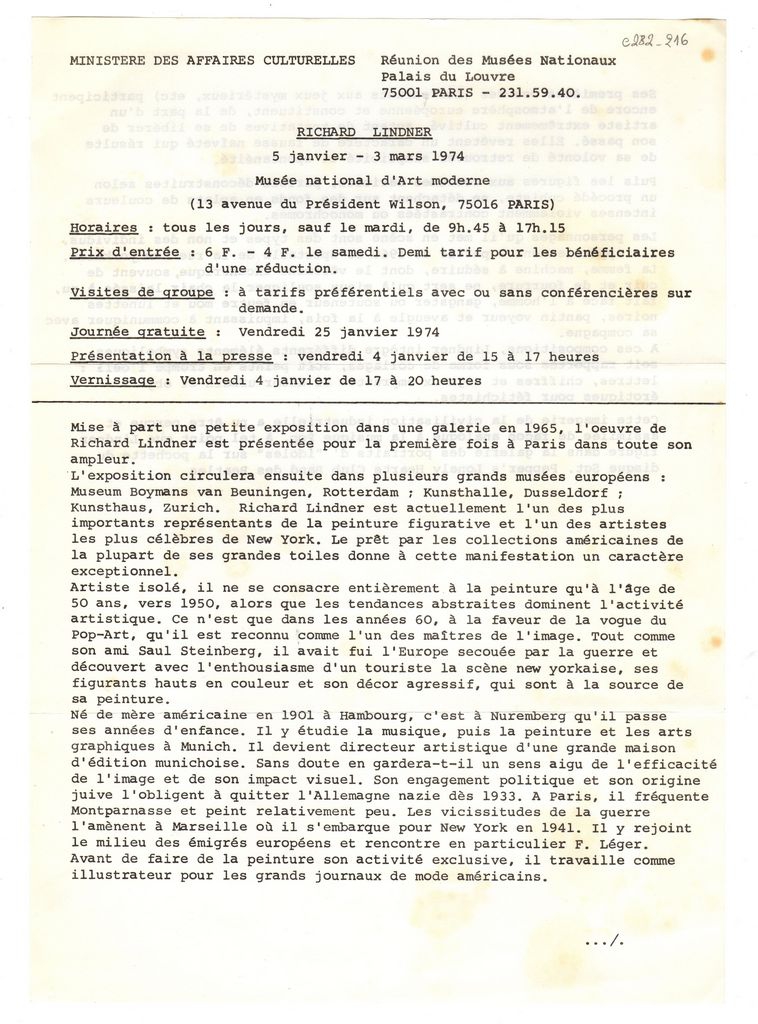 Δακτυλόγραφο δελτίο τύπου, χαρτί διπλής όψης, 30×21 εκ., στα γαλλικά, έκθεσης Richard Lindner, η οποία διεξάγεται στο Μουσείο Μοντέρνας Τέχνης στο Παρίσι. Αναγράφονται λεπτομέρειες για τη διοργάνωση και τα έργα που παρουσιάζονται στην έκθεση.